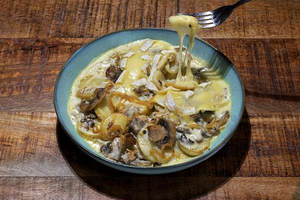 Une sauce gourmande au reblochon AOP de Savoie pour accompagner des pommes de terre aux oignons caramélisés et une petite poêlée de champignons sauté.