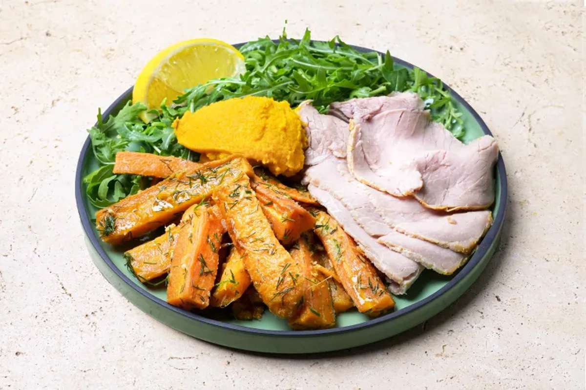 Salade de carotte (Batônnet de carotte (Carotte, jus de citron jaune frais, huile d'olive, miel, gingembre, sel fin, cumin poudre), tagliatelle de carotte (Carotte, vinaigre de riz, sucre, curry madras, poivre, coriandre, sel fin, aneth), Escalope de Veau (Noix de veau origine France, huile végétale, ail, sel fin), Condiment harissa (Carotte, huile d'olive de grignons, jus de citron jaune frais, harissa, sel fin, cumin en poudre), Roquette, Vinaigrette citron