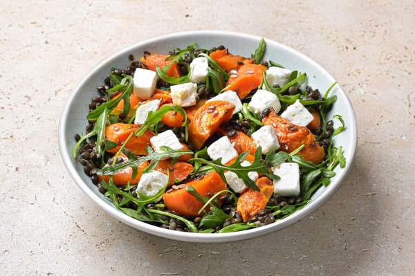 Notre cheffe a pensé pour vous une salade healthy et sans gluten. Un mélange de lentilles vertes, de feta AOP, de potimarron français et de roquette fraîche. Une salade gourmande riche en antioxydants !