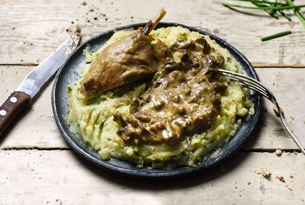 Des pommes de terre cuites dans le lait, une belle moitié de cuisse de canard et des échalotes revenues à la poêle.